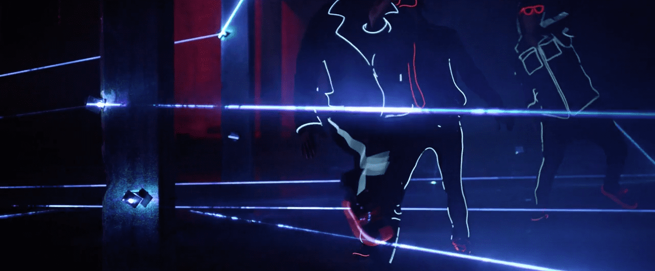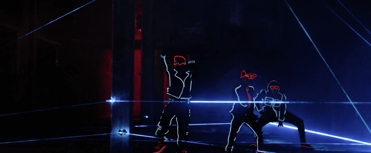 We positioned full-color custom-built lasers throughout the venue, but the real work happened with strategic mirror placement. The mirrors redirected laser beams into triangular patterns that appeared suspended in space, creating convincing geometric structures made entirely of light. We modeled everything in Cinema 4D before implementation. With film crews and dancers moving through laser beam paths, you need to know exactly what you’re building before you start. The two-day night shoot required two senior technicians and two assistants to execute the full installation.